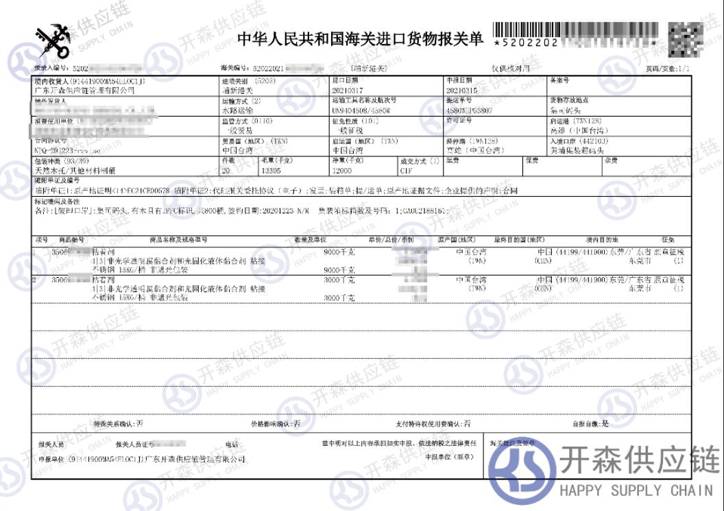 原文標題:臺灣粘合劑進口報關清關代理服務【經典案例】
