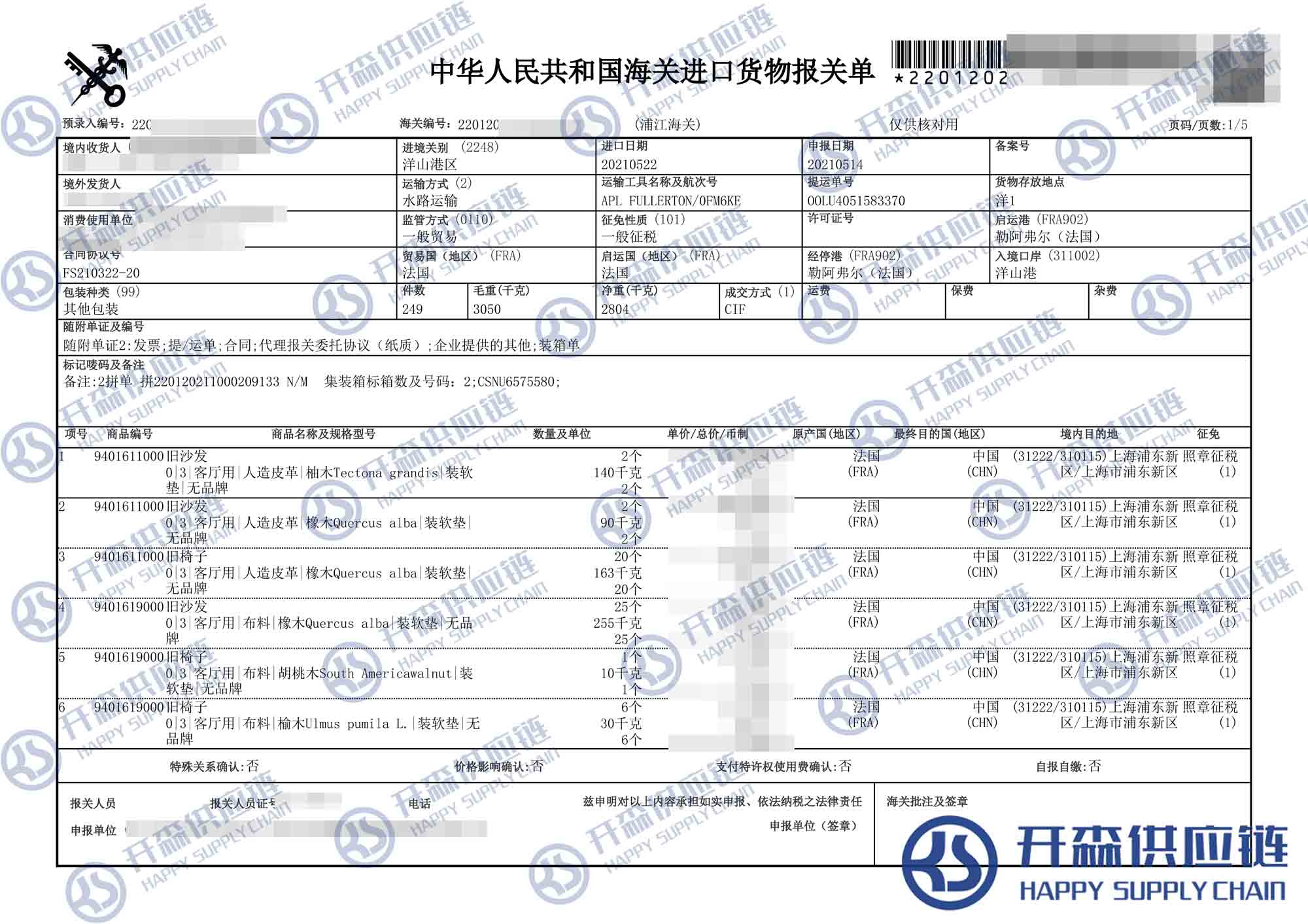 開(kāi)森供應(yīng)鏈擁有十余年豐富的二手舊家具進(jìn)口報(bào)關(guān)操作經(jīng)驗(yàn)與案例,為客戶提供家具進(jìn)口一條龍服務(wù);門到門服務(wù)、進(jìn)口資質(zhì)、編碼歸類、代辦進(jìn)口單證代理服務(wù)。安全、高效、快捷,讓客戶省時(shí)省心省成本。