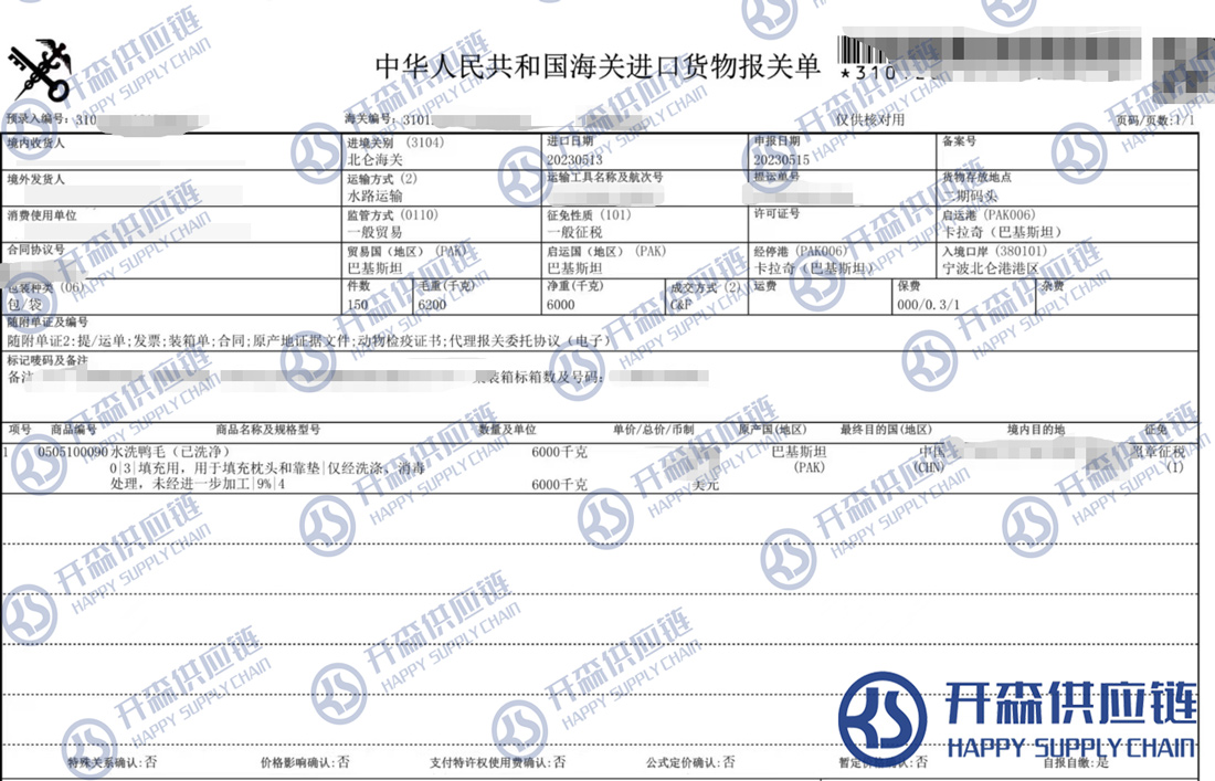 一、寧波港巴基斯坦水洗鴨毛進口報關(guān)代理案例詳情